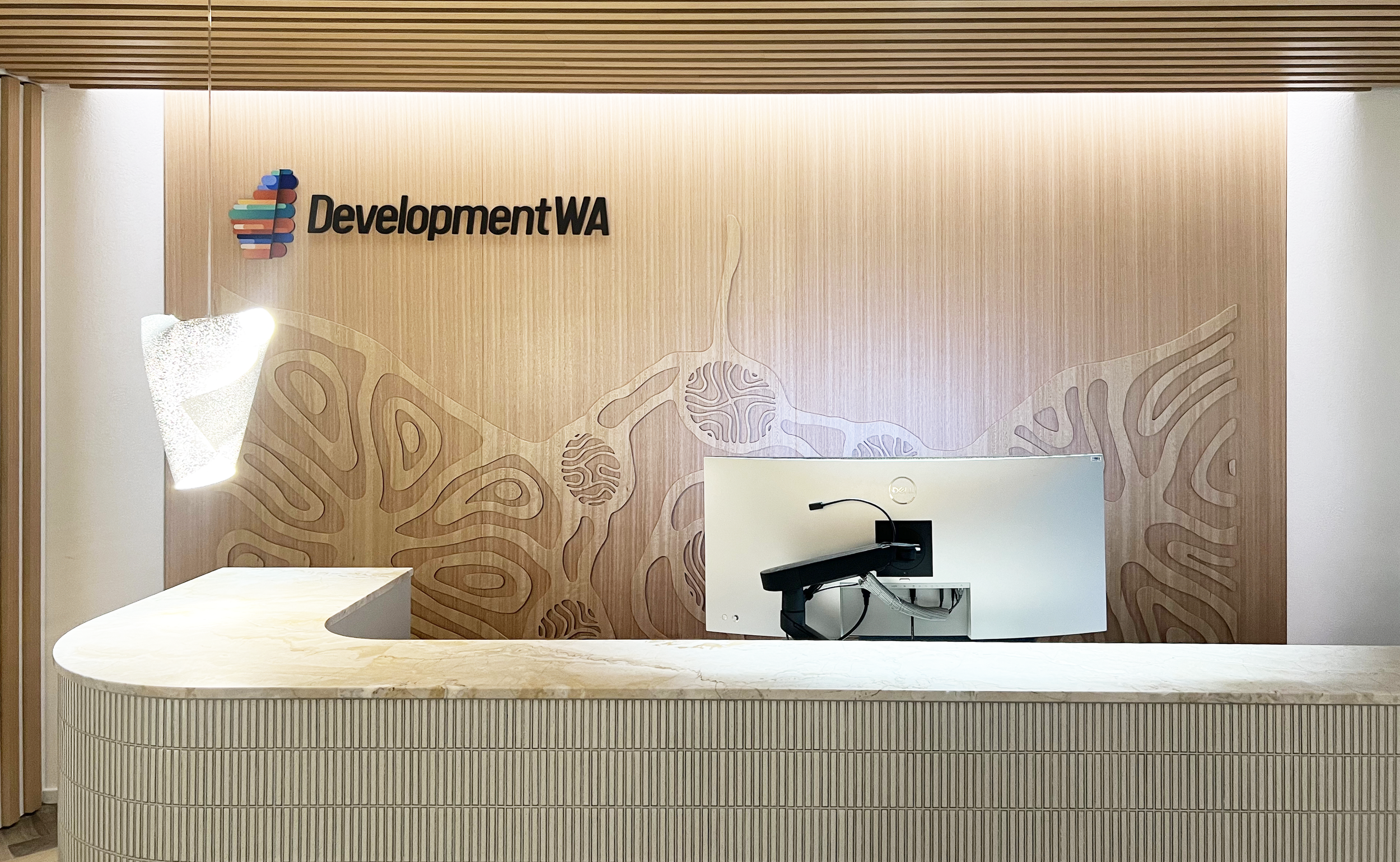 Working with interior designers MKDC, Turner Design developed a signage strategy for the corporate offices of Development WA. The new space at Mia Yellagonga features artistic installations derived from indigenous artworks by Dr Richard Walley.